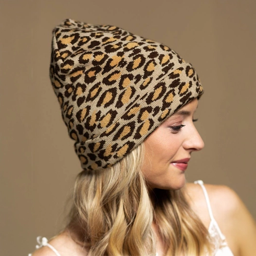 "This is the chicest beanie I've ever owned! The subtle leopard print is totally my style, and it's perfect for keeping me warm and stylish on my travels. The knit feels really high-quality and luxurious. Such a great little accessory!"
